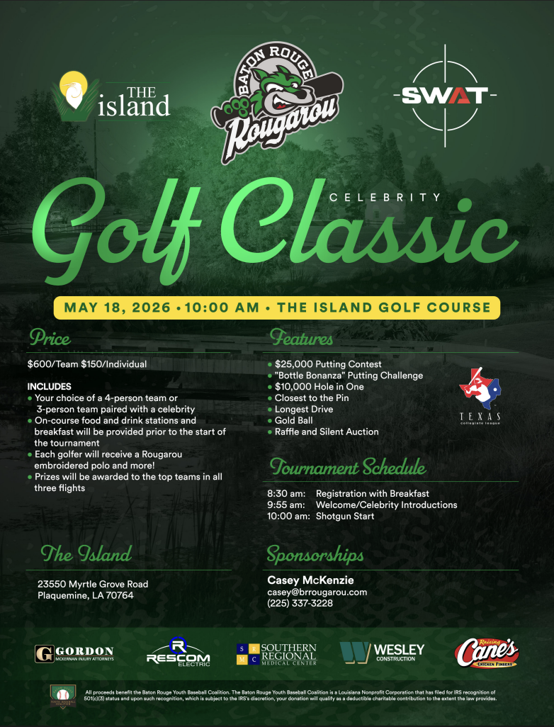 Join us for our annual Baton Rouge Rougarou Celebrity Golf Tournament benefitting the Baton Rouge Youth Baseball Coalition! This years Celebrity Golf Tournament will be held on Monday, May 18th at 10am, with registration beginning at 8:30am. It will be located at The Island Golf Course in Plaquemine.
